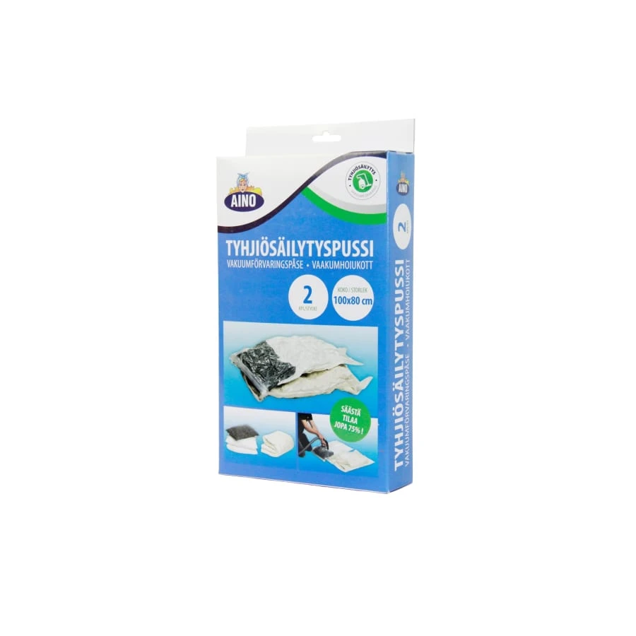Aino Vacuum Storage Bag is airtight, watertight and reusable. Protects textiles from insects, smells and mold. This handy product allows storing clothes and other textiles by taking little space. Has a zip fastener. Saves space up to 75 %. The package contains two pieces of bags.