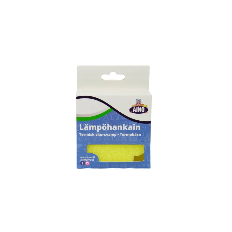 Aino temperature controlled sponge reacts on the temperature of water. The sponge is hard whern used with cold water. The sponge becomes soft when the temperature of cleaning water is warm. With this special sponge it’s possible to clean all kinds of surfaces which can be washed by water.