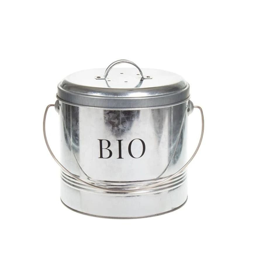 En kompostbehållare som är så vacker att den kan ställas ut i köket. Zinkfärgad plåt med den vita texten ’BIO’ på sidan. Storlek 19 x 17 cm. Produktlängd/djup: 19cm Produktbredd: 19cm Produkthöjd: 20 cm