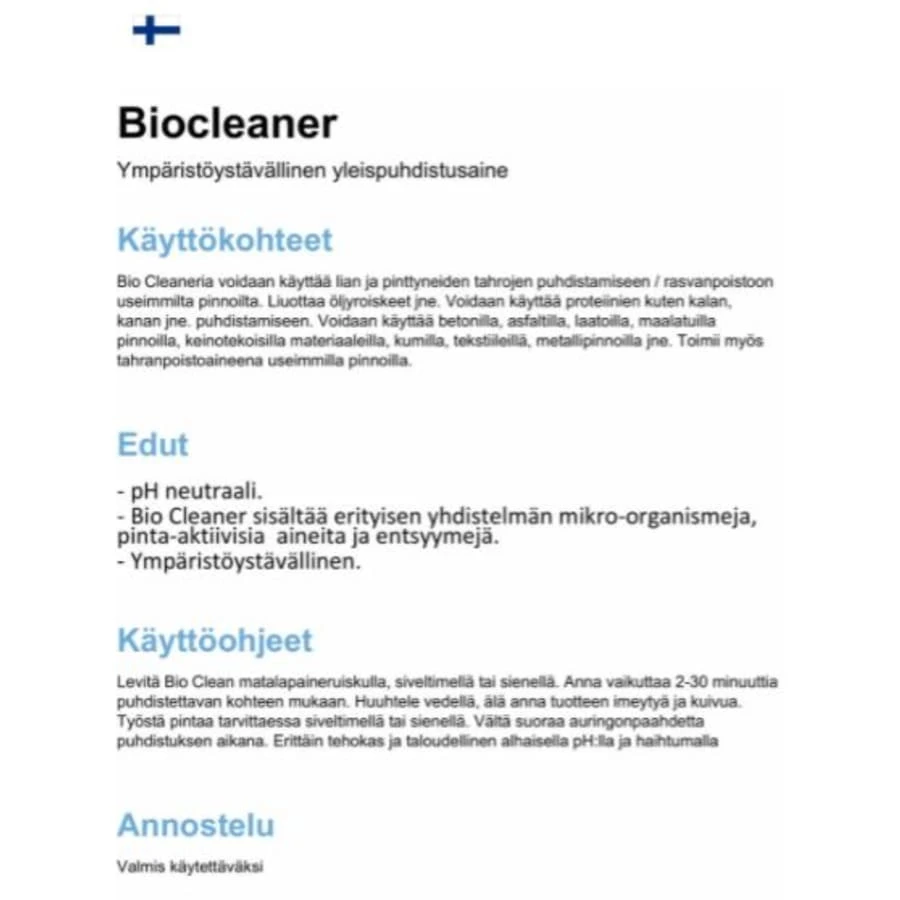 Bio Cleaner kan användas för att rengöra/avfetta smuts och envisa fläckar från de flesta ytor. Löser upp oljespill, sot etc. Kan användas för att rengöra proteinrester som fisk, kyckling m.m. Kan användas på betong, asfalt, kakel, målade ytor, konstgjorda material, gummi, textilier, metallytor etc. Fungerar även som fläckborttagare på de flesta ytor.