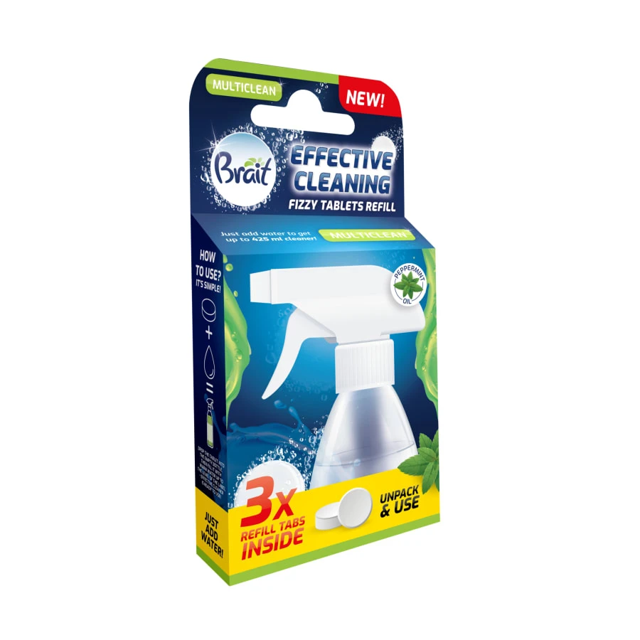 3 x 2 g tabletter. Allmänrengöringsmedel för alla ytor. Den friska doften av mintolja. Tillsätt bara vatten + en tablett så får du 425 ml kraftfullt rengöringsmedel. När hemstädning och miljö är viktigt för dig. Mindre utsläpp inom transporter. Mindre plastavfall. Ingredienser 99% naturligt ursprung.