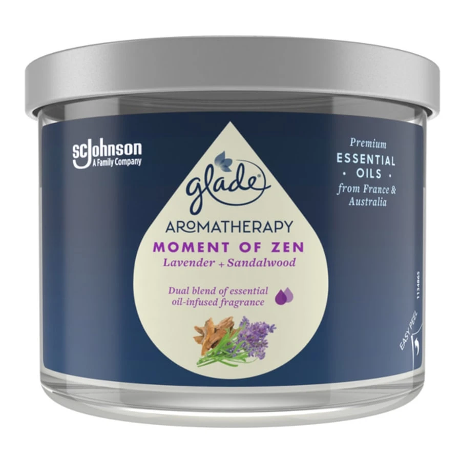 Glade Aromatherapy Candle contains consciously crafted essential oils. Created with 30% RSPO-certified palm wax. Made without parabens, phthalates, nitro musks, artificial colours. Relaxing Moment of Zen consists of lavender and sandalwood.