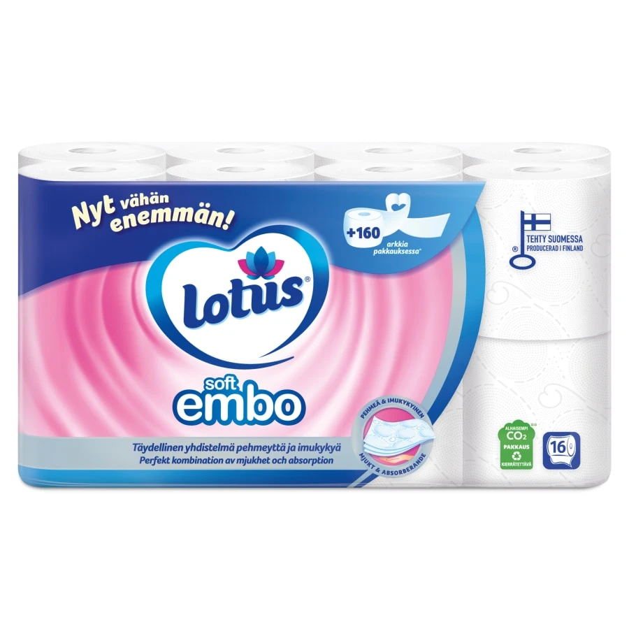 For over 40 years, the reliable and high-quality Lotus Soft Embo toilet paper has been the favourite toilet paper in Finland. Lotus Soft Embo’s perfect combination of softness and absorbency ensure a pleasant experience. Soft and gentle Lotus Soft Embo is also suitable for sensitive skin. Lotus Soft Embo toilet paper rolls come with a recyclable, compostable and flushable Flush&Go® core. The Flush&Go® core dissolves in water just like toilet paper. Lotus Soft Embo is made in Finland at the Nokia paper mill. The product has been granted the Nordic Ecolabel and is dermatologically tested. Made from FSC-certified fibre. The rolls come in a recyclable packaging, which contains at least 30% recycled plastic to reduce the carbon footprint of the packaging.