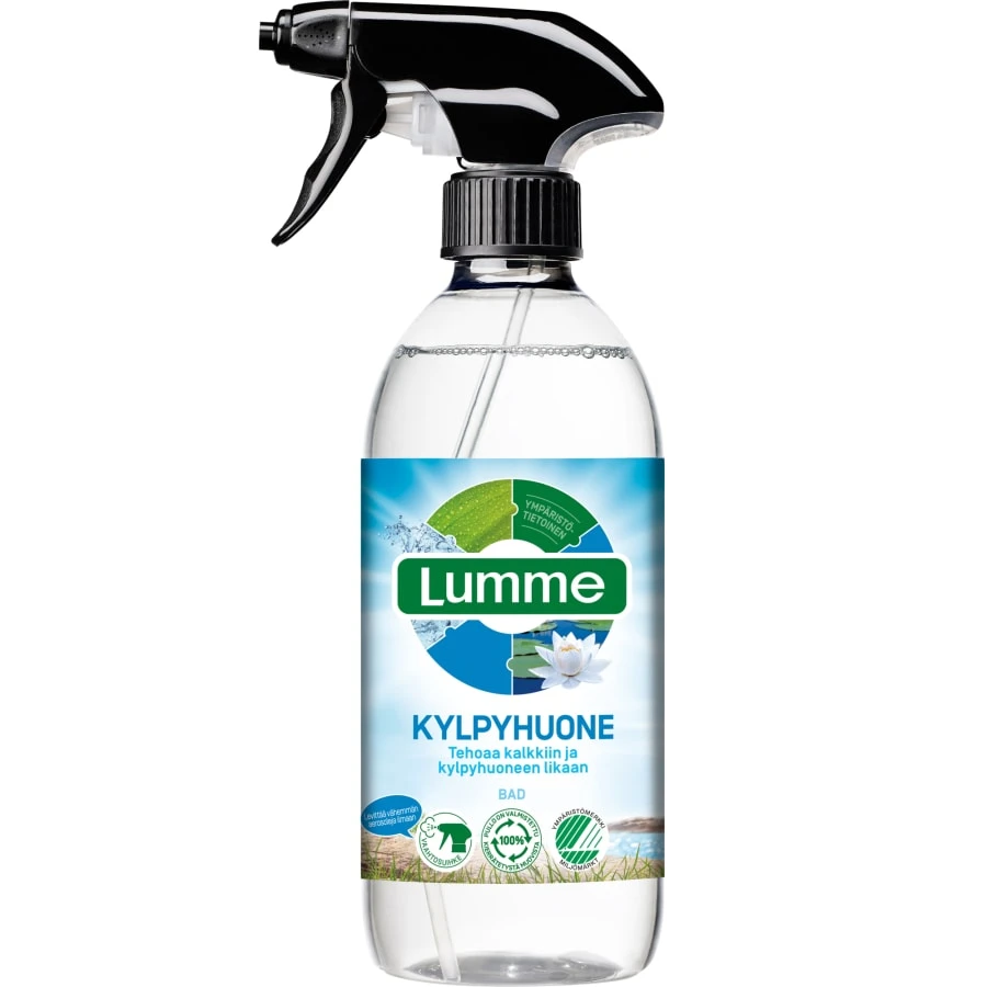 Swan-labelled Lumme Bathroom Cleaning Spray has a fresh scent of water lily and contains carefully selected ingredients from renewable raw materials. It removes effectively limescale and bathroom soil and is suitable for any surface that can withstand water. Lumme Cleaning Spray has a dispersion limiting nozzle that reduces aerosols during cleaning and reduces the risk of inhalation of the substance. The bottle is made of 100% recycled plastic. Lumme Cleaning Spray is manufactured in a factory powered by 100% wind power, renewable energy. Vegan-labelled and dye-free. The bottle is recycled as plastic packaging.