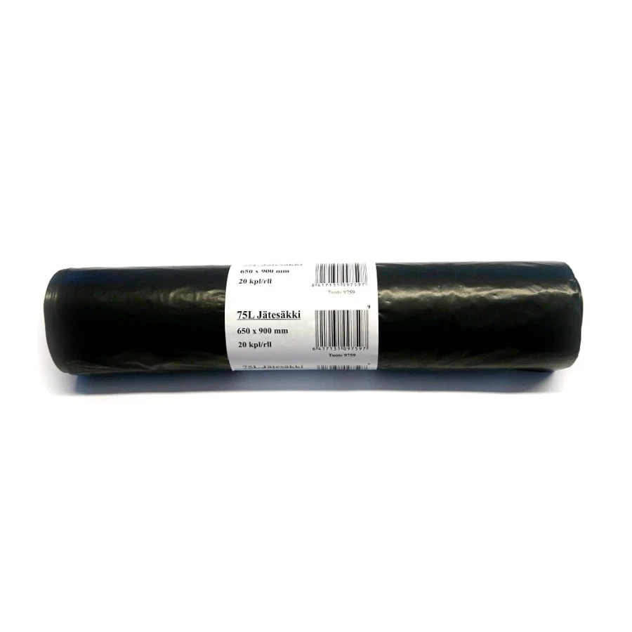 Black 75L garbage bag (20 pc/roll). Affordable but durable. Size of the bag: 650 x 900 mm.