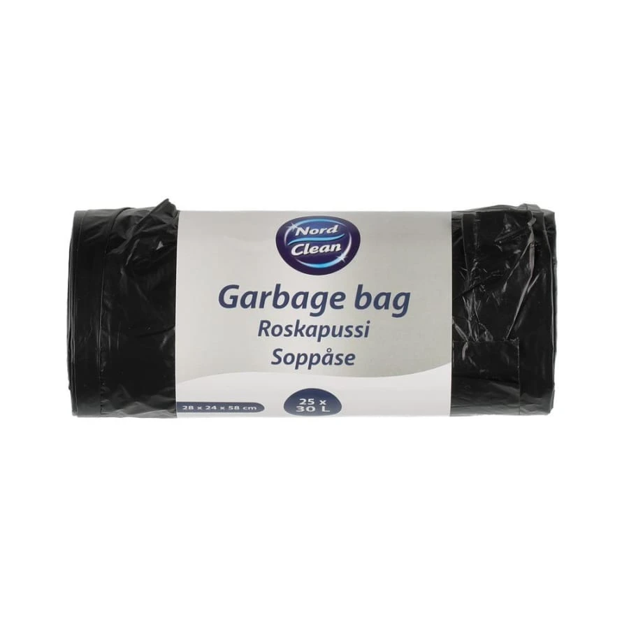 Black garbage T-shirt bag with handles. Volume 30 liters. Thickness 11 micron. 25 pcs in a roll.