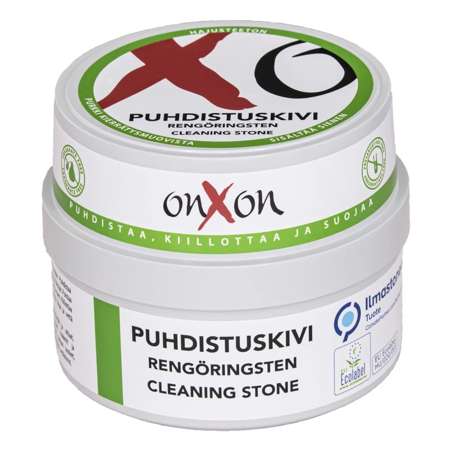 OnXOn Cleaning stone cleans, polishes and protects. Persistent stains and other dirt and grime – such as oil, blueberry, or paint – disappear in the blink of an eye. Leaves a dirt and water-repellent surface. Protects metal surfaces from oxidation and discolouring. Does not corrode the surfaces. Gentle on the skin. Odourless. Does not irritate the respiratory tract. The product is suitable for the following surfaces: sinks and basins, cookers and ceramic hobs, induction cooktops, ovens and grills, marble and granite countertops, tiles and tile seams, showers and taps, sauna benches and glass doors, garden furniture, bicycles, fireplaces (brick, soapstone, pottery), glass doors of fireplaces, gutters. The jar is made from recycled plastic. Only solar energy is used the production. OnXOn Cleaning stone is carbon-neutral, and the small residuals of carbondioxide are compensated. Does not contain perfume, preservatives or colorings.