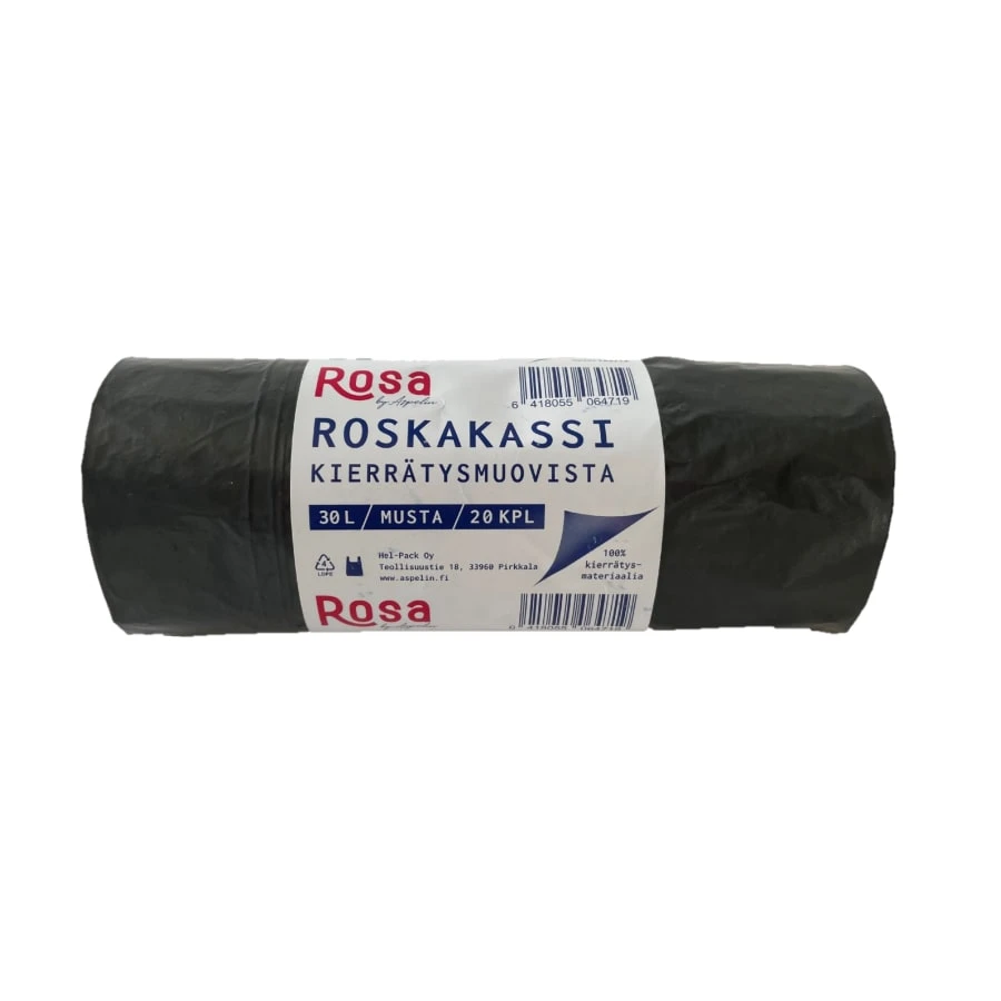 Rosa garbage bag 30 l black 20 pcs/roll, 520×600 mm, 20 my. Made from 100% recycled material.