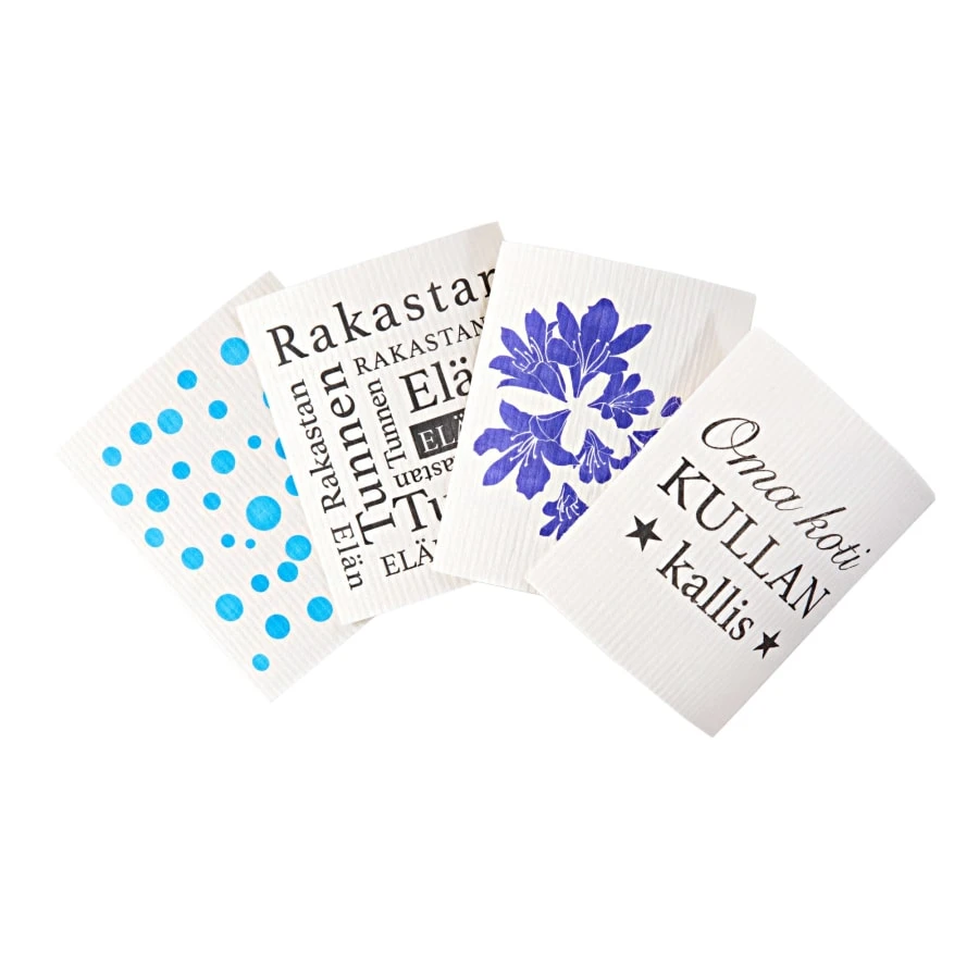 SINI Miina-Liina is a printed sponge cloth with new designs. Miina-Liina has four different pattern options. The sponge cloth is an absorbent and durable cloth that is well suited as a basic cloth for the kitchen or bathroom.