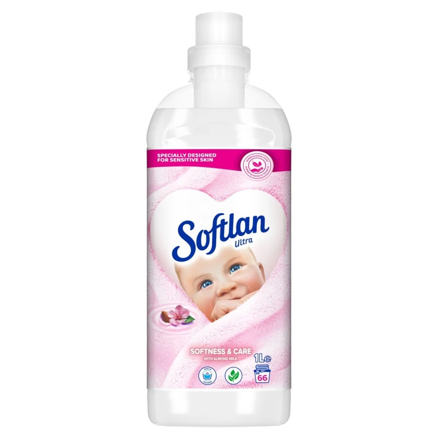 Softlan Softness & Care fabric softener makes your laundry delightfully soft and easy to handle, and leaves behind a mild almond scent. Makes ironing easier, removes static electricity and is suitable for all fabrics. Contains a plant-based preservative. Dermatologically tested formula.