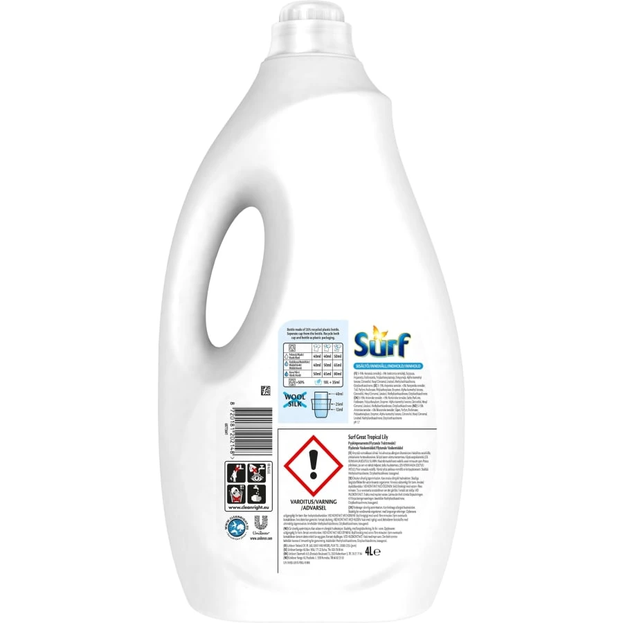 Surf Great Tropical Lily tvättmedel tar hand om dina kläder. Det flytande tvättmedlet ger dina kläder en härlig doft som håller länge efter tvätt. Din tvätt blir gnistrande ren och nytvättad. Surf – innehåller ingredienser som kommer från naturen och doftar länge.