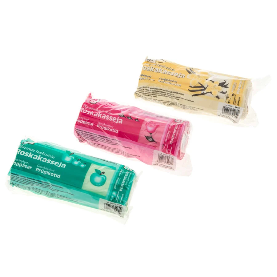 Bag size 15 x 30 cm. Vanilla 16pcs, rose 17pcs and apple 17pcs. With handles.